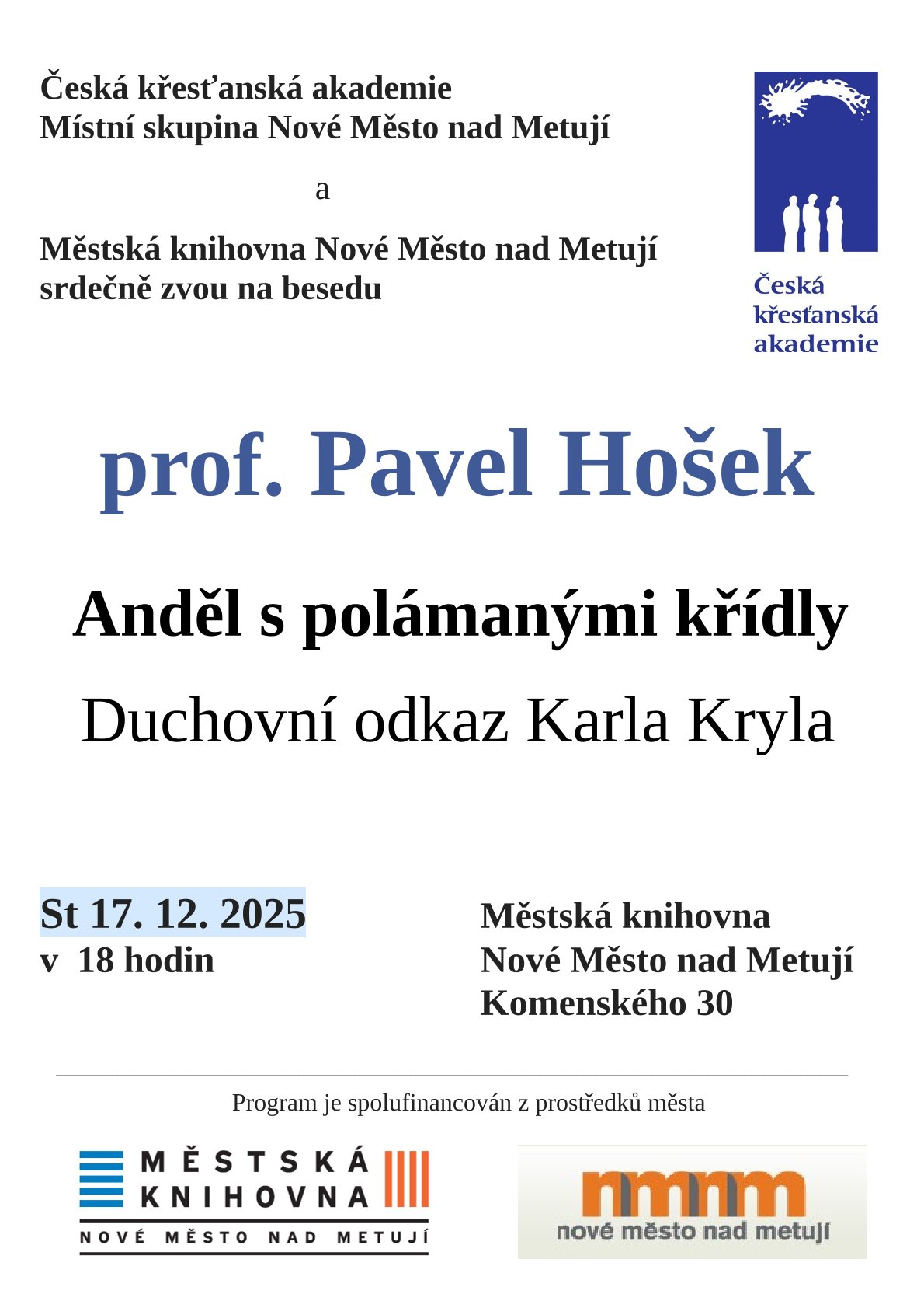 Anděl s polámanými křídly 18.00 17. 12. 2025 Městská knihovnaKomenského 30Nové Město nad Metují, 549 01Zobrazit lokalituMapa Městská knihovna Google kalendář Zobrazit celý kalendář