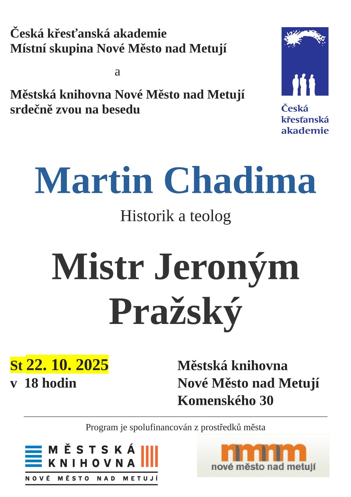 Martin Chadima: Mistr Jeroným PražskýNapsal Husův sbor NMNM / 15. 10. 2025 Martin Chadima: Mistr Jeroným Pražský 18.00 22. 10. 2025 Martin Chadima: Nezvladatelný buřič – Jeroným Pražský (ČT, 2015) Městská knihovnaKomenského 30Nové Město nad Metují, 549 01Zobrazit lokalituMapa Městská knihovna Google kalendář Zobrazit celý kalendář