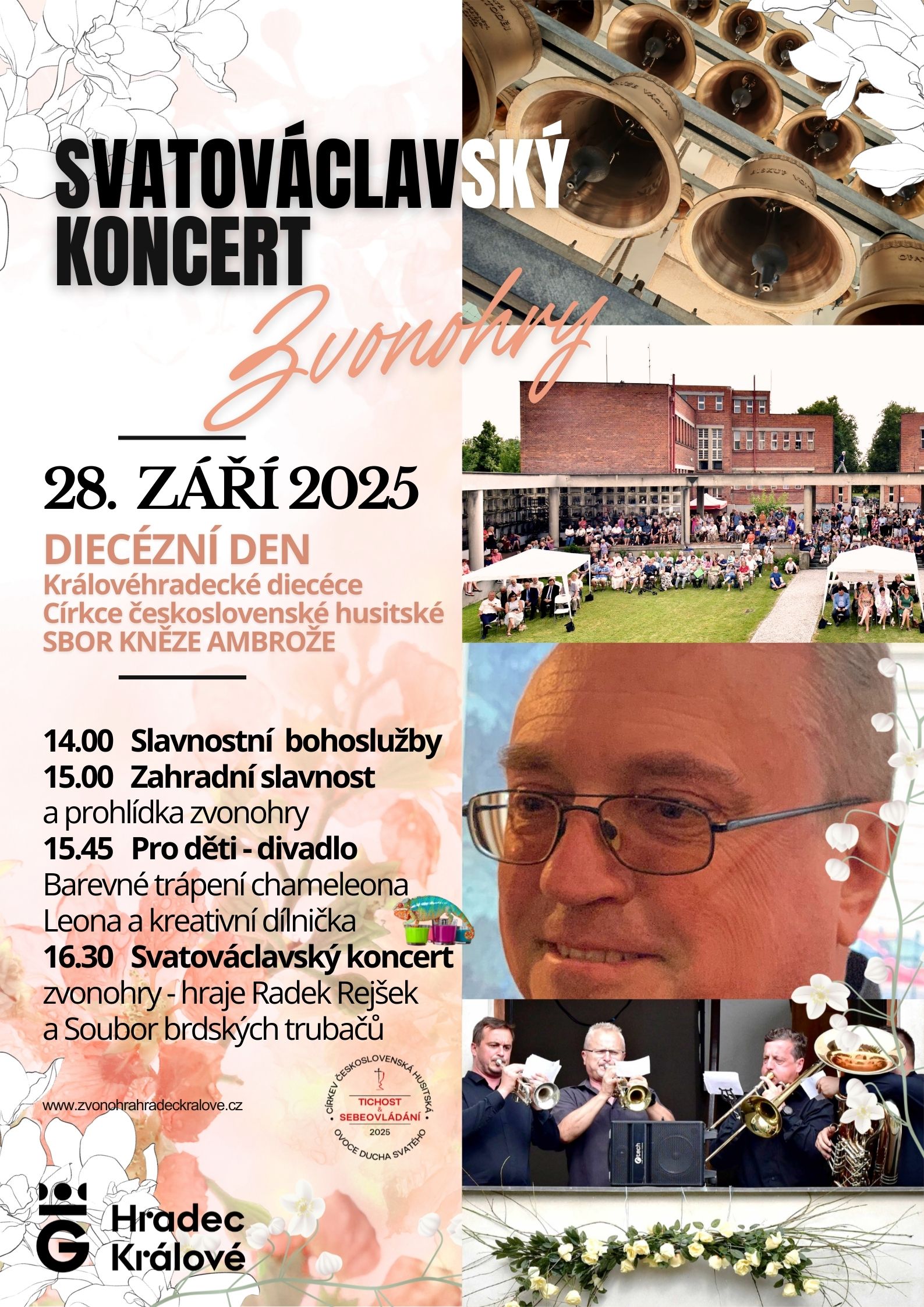 Máme už za sebou celkem pěkně navštívené koncerty zvonohry. Naši posluchači odcházejí od Ambrože s úsměvem na rtech a tady jeden z komentářů: „Pro netrénované ucho zprvu trochu nezvyklý a zvláštní vjem. Po chvíli však zavřete oči a ponoříte se do nádherných tónů, které vás rozechvějí. Krásný zážitek. Děkuji.“ Zveme Vás tedy na slavnostní Svatováclavský koncert zvonohry, kde slavnost uvedou trubači členů Hradní stráže a koncert odehraje přední český zvonohráč Radek Rejšek. Můžete se těšit na slavnostní bohoslužbu s liturgií Farského od 14 hodin, zahradní slavnost, komentované prohlídky zvonohry samotným mistrem zvonařem Petrem Rudolfem Manouškem. Pohádku pro děti „Barevné trápení chameleona Leona“ přijede zahrát skvělé divadlo Kordula, bude připravená kreativní dílna pro děti a školička s Františkou Pospíšilovou. K dispozici bude káva, čaj a občerstvení pro účastníky koncertu. Možná vás tedy osloví pozvání do podzimního Hradce, projdete se Jiráskovými sady na nedaleký magický soutok Labe a Orlice nebo po Labi vyrazíte na projížďku lodí od Náplavky – místní skvělé restaurace. A po obědě vaše kroky doputují až k Ambroži, kde budeme moci spolu vytvořit přátelskou atmosféru, laskavé prostředí, kde můžeme sdílet své radosti i starosti s ostatními náboženskými obcemi. Budeme moc rádi za váš ohlas – zda plánujete na DIECÉZNÍ DEN do našeho společného „diecézního centra“ Sboru kněze Ambrože přijet. Z organizačních důvodů vás prosíme o přihlášení nejlépe celé skupiny na: dieceze.hradec@ccsh.cz. Vstupné bude jen symbolické – 100 Kč na občerstvení. Přijeďte se potěšit hudbou a novými zážitky, těšíme se na vás.